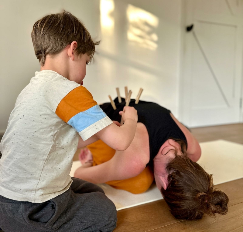 Een favoriete oefening van de kinderen is de knijpermassage, waarbij ouder en kind veranderen in een egeltje met stekels op de rug. Daarbij moeten ze goed opletten dat ze voorzichtig zijn de knijpers vastzetten, zodat de huid niet bekneld raakt. Deze speelse oefening zorgt altijd voor veel gelach, concentratie en een gevoel van verbinding.